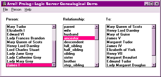 Screen shot 1 shows the starting point of the sample application, where a family tree is first loaded. Screen shot 2 shows the query dialog box. It contains three list boxes. The first is a list of individuals, and the second is a list of family relationships. When the user selects an item from the first two list boxes, the third list box is filled with the names of the individuals who satisfy that family relationship. In the example the user requested the ancestors of ‘James I’ from a fragment of the British royal family tree.