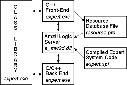 With Amzi! Prolog, development and compilation can be done within a Windows Integrated Development Environment (IDE), or you can edit a Prolog source file and compile from the DOS command line. The compiled source resides in a proprietary binary format file with an .XPL extension which is loaded by the "logic server" - a Prolog engine implemented in C which is provided in .DLL and .OBJ formats for linking to your application. Some easily implemented conventions allow you to call Prolog 'functions' from within a C (or C++ ... from now on I'll just lump them together as "C++") program, or to call from Prolog to C++ functions. With the comprehensive API provided for calling the logic server, you can manipulate the Prolog component to any level of detail desired, or you can call higher-level functions that hide the Prolog internals. This mix of capabilities made it the ideal choice for the project.