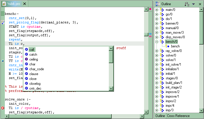 The outline (see above) is created when a Prolog source file is opened or saved. By default the predicates are shown in the order they appear in the file. To sort them in alphabetical order: