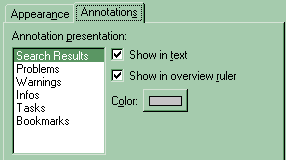 Tab Width How many spaces wide a tab is Print Margin Column The width of the paper for your printer Show Overview Ruler Controls display of the right margin area that provides quick links for error, to-do, bookmark and search markers Show Line Numbers Displays line numbers to the left of each line Highlight Current Line Highlights the entire line where the cursor is located Show Print Margin Displays a line at the print margin column Colors Controls the colors of the text and highlights Background Color Sets the background color for the editor